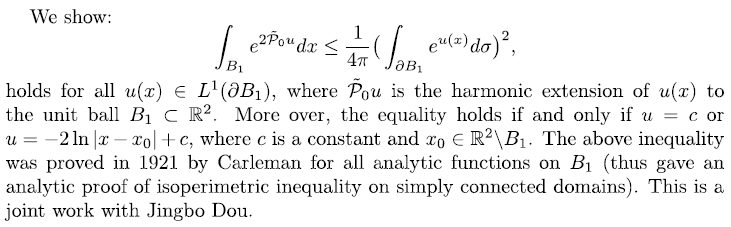 报告人简介: 朱梅俊,美国Oklahoma大学数学系终身教授,中国科学技术大学访问教授。研究领域为偏微分方程及其在整体几何和图像处理中的应用。近些年研究兴趣集中在非线性方程正解的分类及其爆破分析、最佳几何不等式、曲线流、图像处理中的数学理论等。在Duke Math. J.CPAMGAFAAdv. Math.IMRNJFA等著名国际数学期刊发表学术论文30余篇。2001年获美国数学会Centennial Fellowship奖。