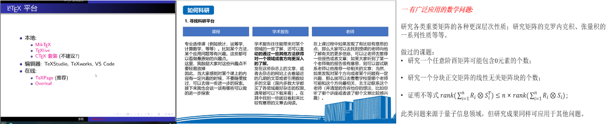 多凯、刘晋玮、宋智威三名同学分别带来LATEX的介绍与应用、科研(技能与形式)介绍。三名同学根据自己的经历与切身体会,讲述了科研之路所需提前做好的准备工作,并为同学们的科研发展提供了宝贵的建议。