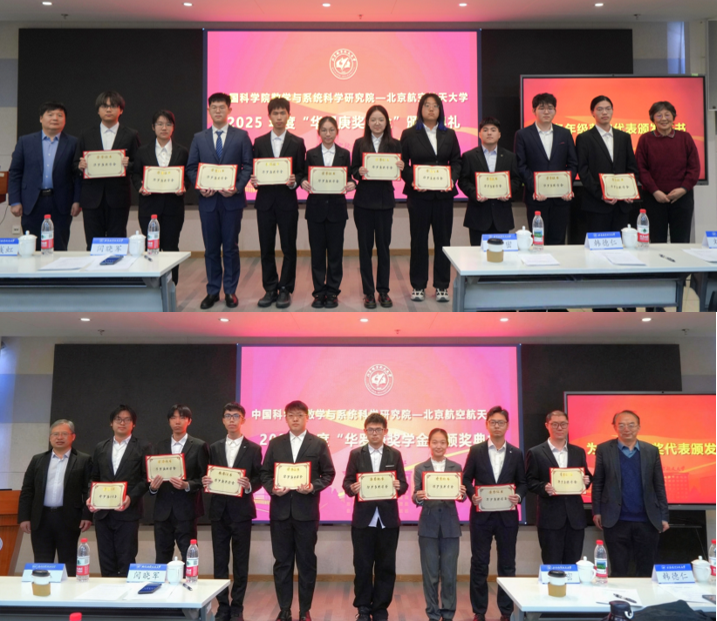 刘霞主任宣读获奖名单,华密、闫晓军、戴彧虹、韩德仁为2025年度“华罗庚奖学金”北航获奖员工代表颁奖。