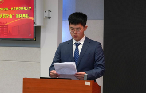 获奖员工代表、华罗庚数学拔尖基地2024级员工陈乘功发言。他表示,将努力传承和弘扬华罗庚精神和以“空天报国”为内核的北航精神,积极参与到学科培养、人才发展的科研中,深耕数学领域,不断追求卓越,努力成长为国家需要的基础学科拔尖创新人才。