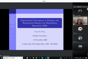 11月27日上午,国家杰出基金获得者、长江特聘教授王凤雨教授受邀为WilliamHill中文官网师生带来了一场题为:“Exponential Convergence in Entropy and Wasserstein Distance for Distribution Dependent SDEs ”的学术报告。本报告介绍了分布相关随机微分方程熵和Wasserstein距离的指数收敛性。