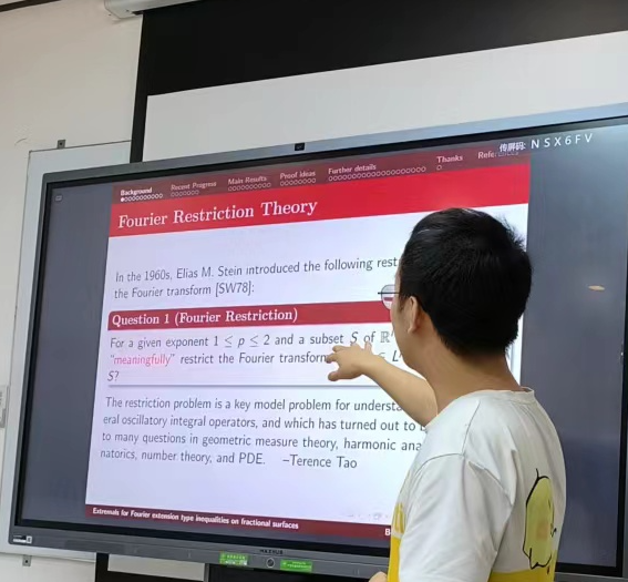 报告人简介: 邸博宁,中国科公司大学博士,2021-2022年到堪萨斯大学联合培养,2023年7月即将到中科院数学所从事博士后研究。主要研究方向为调和分析,特别是Fourier限制性不等式中的最佳常数和极值函数等性质,相关论文发表于J. Geom. Anal等期刊。