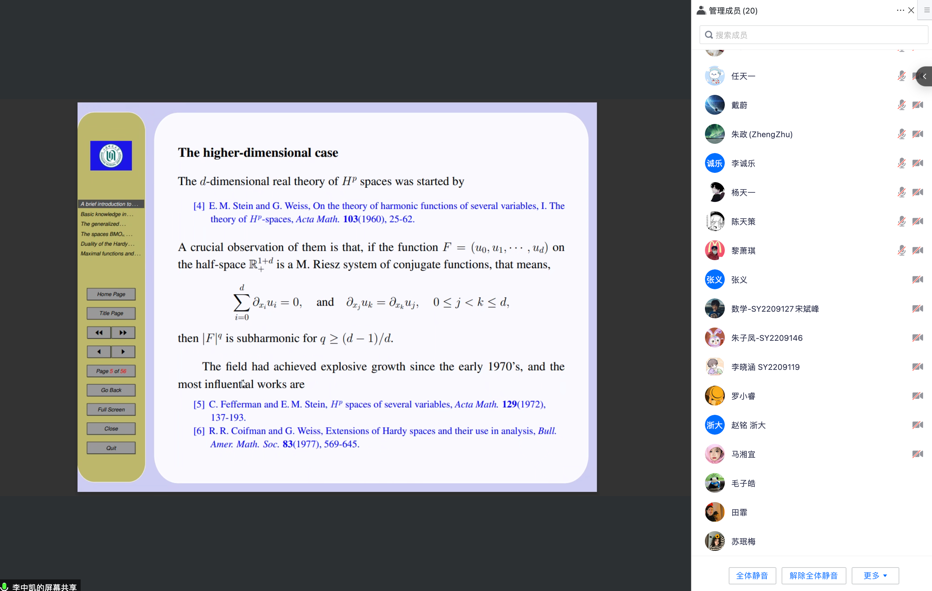 报告主要介绍了和Dunkl算子相关的Hardy空间理论。李老师首先详细介绍了经典Hardy空间理论,以及数学家Dunkl是如何引入Dunkl 算子的详细过程。 通过根系生成的反射群以及给定的重数函数可以得到一类交换的微分算子,这个算子是经典Laplace算子的延拓。在引入了广义的调和函数,Riesz变换,BMO和BMC空间之后,成功证明了H1和BMO空间的对偶。最后李老师还提出一些非常深刻的公开问题。参会老师就报告内容行了热烈讨论交流。