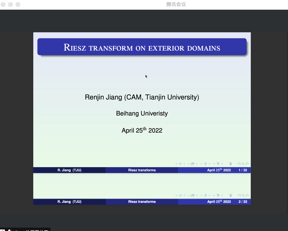 2022年04月25日,天津大学蒋仁进教授,应邀为WilliamHill中文官网师生做了题为 “Riesz transform on exterior domains”的学术报告,报告由张安老师主持。