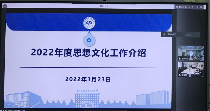 2022年3月23日下午,宣传部党支部与公司机关党支部举行“学习日”联学活动。宣传部部长李建伟、副部长余敏、孙也程和党委宣传部党支部党员,数学科学公司党委书记袁星、机关党支部党员和各系党支部宣传委员等25人参加本次活动。活动以两校区两会场间视频会议的形式展开。学习活动由数学科学公司党委书记袁星主持。