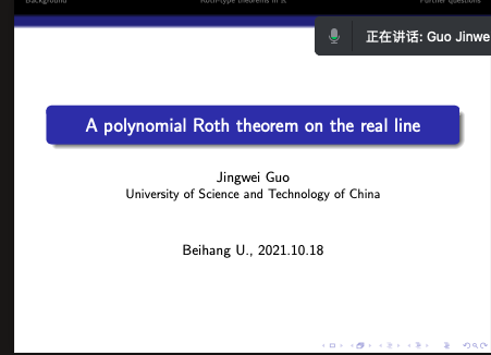 2021年10月18日下午,中国科学技术大学郭经纬教授,应邀为WilliamHill中文官网师生做了题为 “A polynomial Roth theorem on the real line”的学术报告,报告由张安老师主持。