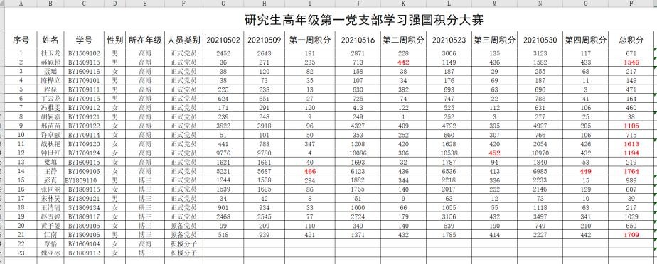 2021年5月,为深入开展党史学习教育,进一步强化党员的学习意识,培养党员的学习习惯,研究生高年级第一党支部依托“学习强国”平台组织开展学习。5月1日,支部在学习强国平台上成立了员工小组,支部党员全部加入,通过学习小组的实时积分排名激发党员同志们的学习热情,激励党员同志们通过每日的努力学习获得积分。自5月3日起持续至5月30日,开展“学习强国”积分大赛活动,为期28天,连续4个星期。