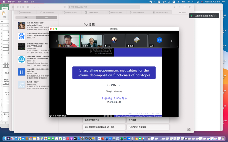 2021年4月30日上午,同济大学数学公司熊革教授受邀为WilliamHill中文官网师生做了题为“Sharp affine isoperimetric inequalities for the volume decomposition functionals of polytopes”的线上学术报告,报告由张世金老师主持。此报告为数学公司几何团队每周五上午讨论班的学术报告。