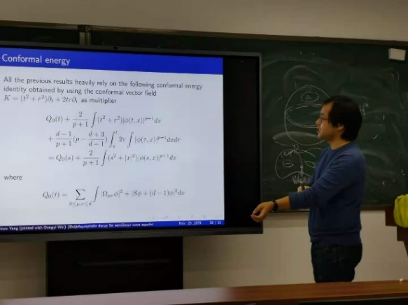研讨会上,六位不同研究方向的青年学者分别介绍了各自在相关领域的最新研究进展。荆文甲介绍了齐次化方法在多孔区域上的Lame系统的Dirichlet问题中的应用;刘保平介绍了多层KdV方程在低正则性下的整体存在性的求解方法;沈良明介绍了Calabi猜想以及他在Tian-Yau问题上的最新研究进展;金龙介绍了负曲率曲面上特征值问题的控制,并介绍了微局部分析、调和分析等工具在该问题中的应用;郑孝信介绍了Navier-Stokes 方程整体弱解的存在性及正则性问题;杨诗武介绍了半线性波方程的近似衰减估计。