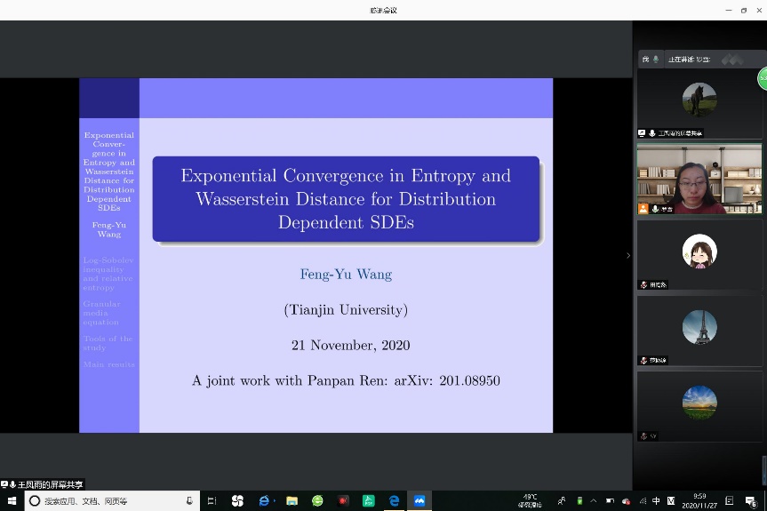 2020年11月27日上午,国家杰出基金获得者、长江特聘教授王凤雨教授受邀为WilliamHill中文官网师生带来了一场题为:“Exponential Convergence in Entropy and Wasserstein Distance for Distribution Dependent SDEs ”的学术报告。报告由WilliamHill中文官网统计与运筹系系主任罗雪副教授主持。