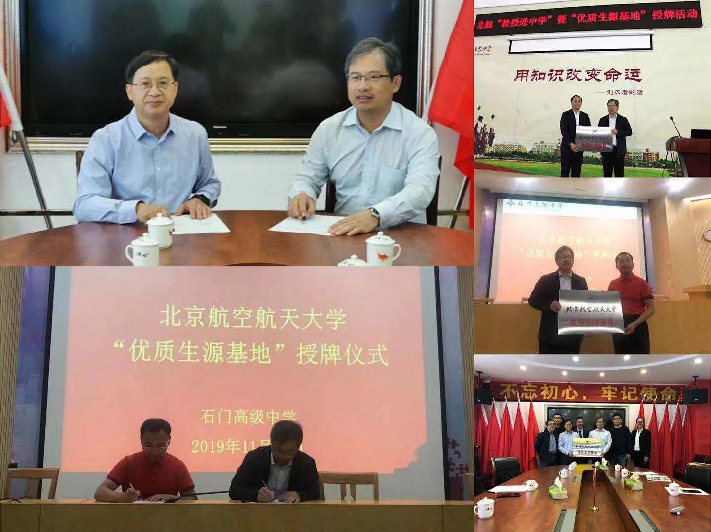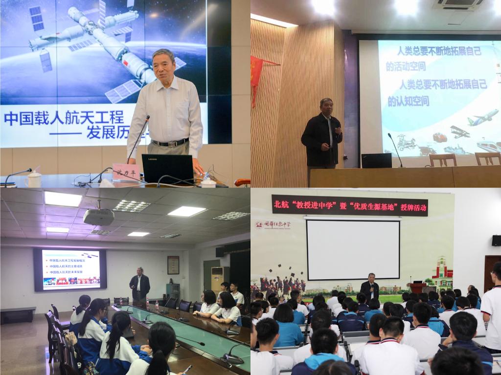 招生工作组一行分别到访了石门中学、顺德一中、顺德国华纪念中学、石门高级中学和佛山一中,在五所中学进行了“优质生源基地”签约和授牌,沈力平教授为顺德一中、国华纪念中学等四所中学的员工做了题为“中国载人航天工程发展历程与展望”的科普报告,结合自身的科研攻关经历,系统而生动地讲述了中国载人航天工程的发展历程概况、已经取得的主要成就以及未来的发展方向和展望,并与同学们进行了深入的交流互动,韩德仁教授为中学的同学们简要介绍了北航情况,并鼓励同学们刻苦学习,争取进入理想的大学深造。