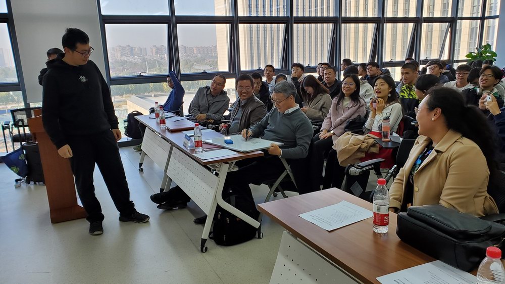 主题党课后,谭镇涛、张翔宇、郭志鹏、王文昊、张造诣5名员工代表依次上台发言,和同学们分享了自己的学习经验、科研经历、学业规划及成长历程。活动最后,黄海军副董事长对同学们的发言进行认真点评并耐心回答了现场同学的提问。