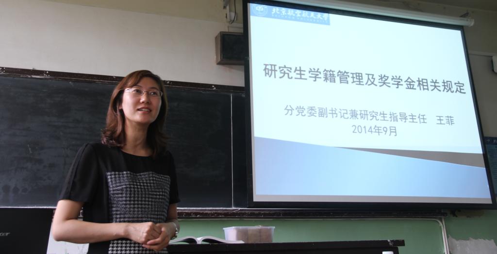 紧接着,王菲老师为大家介绍了公司员工工作相关情况,着重强调了学习上、科研上一定要诚信为本,重点介绍了新的研究生奖学金评定办法,并从方便同学日后工作、生活角度给大家具体说明了几个一定要注意的事项,鼓励大家在学习、科研、生活上积极主动,融入新的环境,创造新成果。