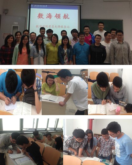 活动内容: 全校同学都可以到教室来,没有专业、年级限制,目前开通以下能: (1)数分、线代、概率等专业课程答疑,解题技巧,题型总结 (2)数学竞赛,建模比赛经验分享,问题讨论。 (3)论文撰写技巧,侧重于与数学相关领域。 (4)想与数学专业同学合作项目,登记相关信息后帮忙联系。 加入我们:(1)现场参与:2014年5月7日——6月22日,每周三下午3:20——5:20,沙河校区J5-204教室。现场会有至少7人数学公司员工党员,包括本科生、硕士研究生、博士研究生,其中研究生至少2人,且必有专业大神,成员实力有保障。(2)线上参与:时间原因不能参加现场答疑的同学,可在ihome或人人上添加【数海领航】为好友,有问题直接发图@我们,或者留言。每周服务站会选派7人线上值班,保证解答速度。(3)质量保障:服务站答疑质量和累计时间将作为公司考察入党积极分子和预备党员的重要渠道,有正规的组织和监管,如有发现态度不端的服务站成员,可以随时通过ihome【数海领航】公共主页、人人主页或者向现场负责人投诉。 联系我们:站长信箱:shuhailinghang@163.com ihome主页:数海领航 人人主页:数海领航欢迎广大师生多提宝贵意见和建议,诚邀您的加入!