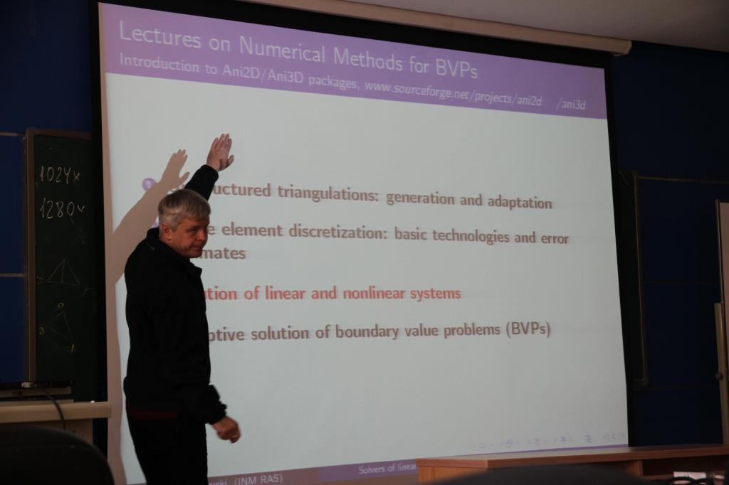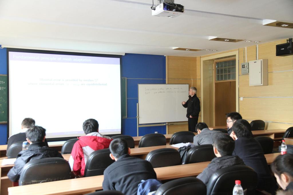 4月1日,Yuri教授就非结构三角自适应网格的生成,有限元方法的误差估计等技术做了详细的介绍。4月2日上午,Yuri教授为我们展示了俄罗斯科公司在自适应非结构网格的生成和边值问题的自适应求解等方面所取得的研究成果。
