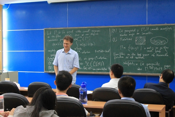 访问期间,C. Blohmann研究员除为公司师生做了一系列的学术讲座外,还为公司员工介绍了德国数学现状,人才培养及研究生教学培养体制和奖学金制度等,认真回答了大家关于留学德国的问题,使大家获益匪浅。9月20日下午,C. Blohmann博士还为北航数学论坛作了一场题为“Groupoids: A tour by examples”的精彩报告。他从广义群的由来及大家熟知的例子出发,自然地引入了广义群的概念,并进一步介绍了广义群与广义群卷积、矩阵论、拓扑广义群、广义群代数、流形等重要数学理论间的密切联系,带领大家初步了解了广义群的重要性。并在讲座结束时认真而详细地回答了大家踊跃提出的学术问题。