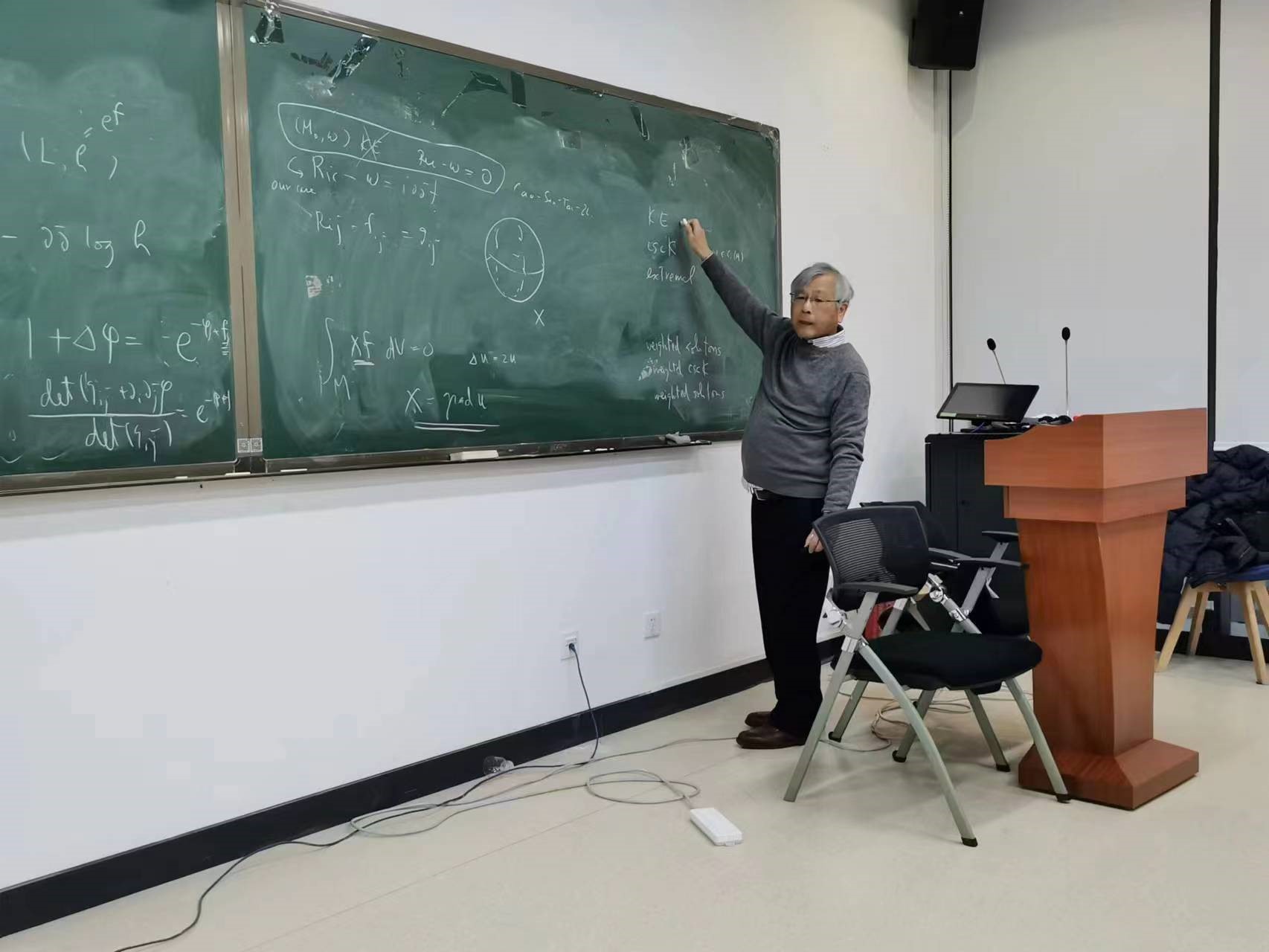 Futaki教授在报告中介绍了一般化的Kahler-Ricci孤立子,包括Kahler-Ricci孤立子,Mabuchi孤立子等。然后介绍了他与合作者关于刻画Fano流形上的Kuranishi扰动中存在加权孤立子的充要条件,即T-等变自同构群的维数不变。