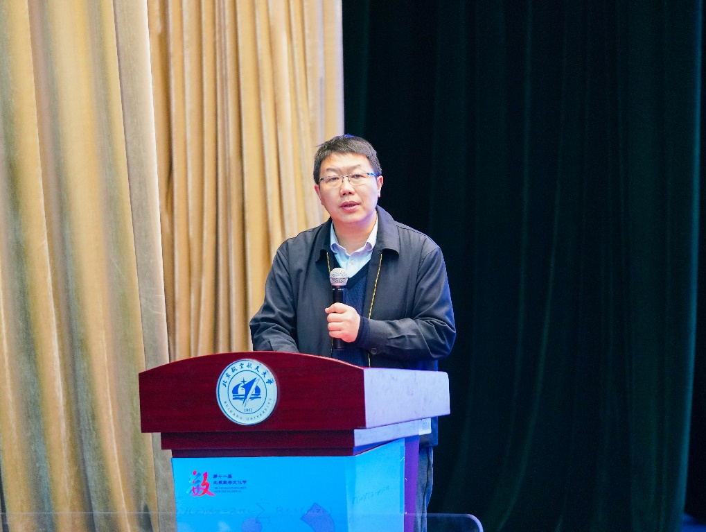 员工代表王钰荃在开幕式上发言。他分享了发现国外代数书籍中的错误并通过邮件与原作者交流的经历,鼓励同学们在学习的过程中要敢于质疑、勤于交流。