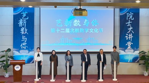 张继平、邓怡、韩德仁、魏茜、本研员工代表共同为第十二届北航数学文化节揭幕。伴随着倒计时的到达与绚丽的光影,2025年“艺新数与你”数学文化节正式开幕。