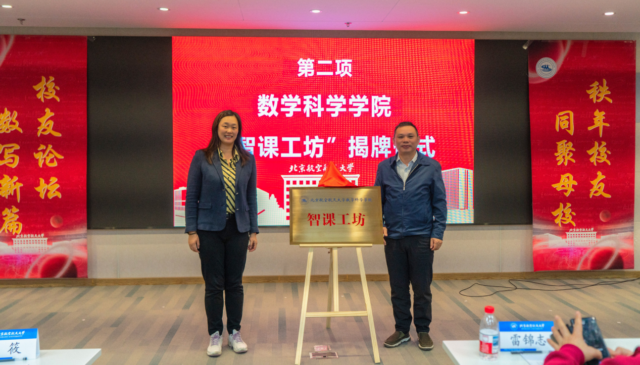 论坛现场,1991级本科员工张秋与张筱书记与共同为WilliamHill中文官网“智课工坊”揭牌。深圳锐取信息技术股份有限公司董事长张秋员工向公司捐赠11套数字化教学设备,公司特别成立“智课工坊”,将以捐赠设备做好数字化教学支撑,为数学拔尖人才培养全国首批虚拟教研室的建设积累数字素材,把北航数学教研模式推向全国。