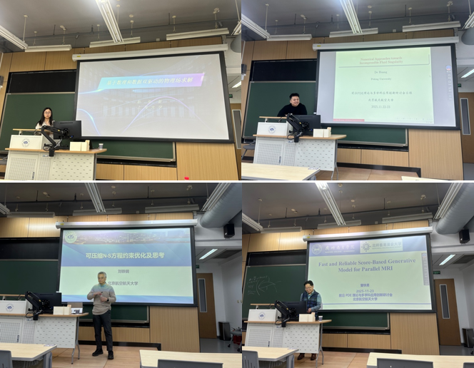 本次研讨会邀请了来自多所知名高校的专家进行学术报告。上海大学彭亚新教授系统介绍了物理信息神经网络在PDE求解、多物理场建模及反问题中的最新进展,并剖析了当前面临的挑战。北京大学黄得教授深入阐述了三维Euler方程组有限时间光滑自相似解的爆破理论、数值方法及计算机辅助证明,并详细介绍了流体奇点形成的关键数值方法思想和近期多尺度自相似爆破的数值结果。威廉希尔WilliamHill刘铁钢教授分享了基于高阶间断伽辽金方法的可压缩气动优化框架,展示了其在翼型减阻与反设计中的高效性能,并探讨了当前可压缩Navier-Stokes优化中存在的关键问题。广州南方公司曾铁勇教授介绍了具有收敛保证的稀疏角CT重建算法、基于深度去噪先验的MRI重建方法及参数更新的去噪融合网络框架。